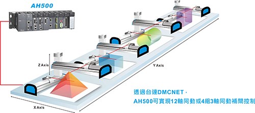 AH500的優(yōu)異運(yùn)動(dòng)控制功能,可實(shí)現(xiàn)任意三軸直線補(bǔ)間、任意兩軸圓弧補(bǔ)間、及任意三軸螺旋補(bǔ)間與連續(xù)補(bǔ)間功能,透過臺(tái)達(dá)DMCNET高速通訊網(wǎng)絡(luò)架構(gòu),可達(dá)到1ms的指令周期內(nèi)12軸同動(dòng)或4組3軸同動(dòng)補(bǔ)間功能。無論是復(fù)雜的過程控制或是精密的運(yùn)動(dòng)控制需求,都能透過AH500來實(shí)現(xiàn),有效應(yīng)用于各種產(chǎn)業(yè)機(jī)臺(tái),如建材機(jī),經(jīng)編機(jī),食品包裝機(jī)等等。