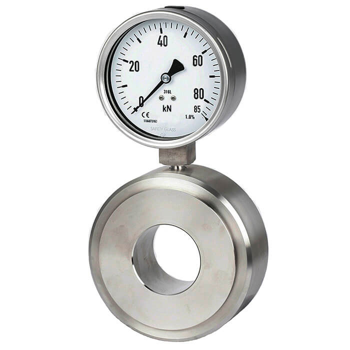 使用液壓原理測(cè)量力:作用在活塞上的力導(dǎo)致壓力增加,這可以在連接的顯示儀器上看到。顯示儀表的標(biāo)度可以用各種單位來(lái)定義(例如,N、kN、kg、t)。